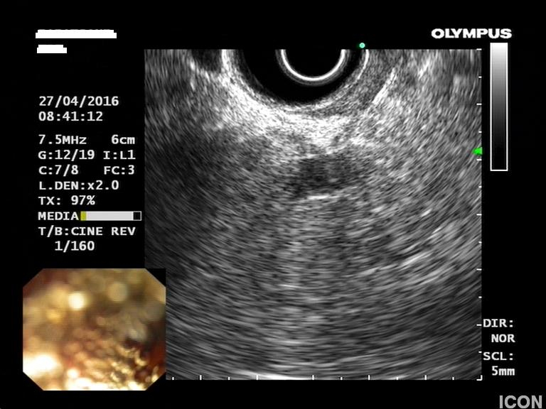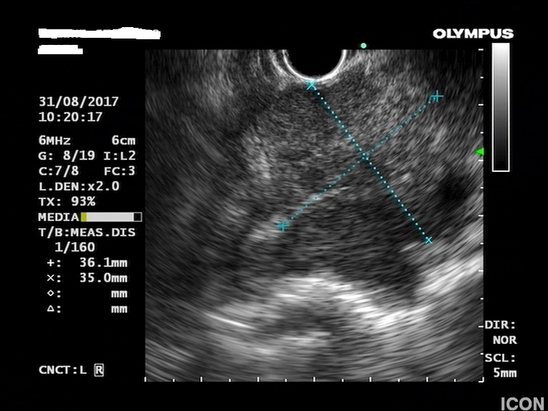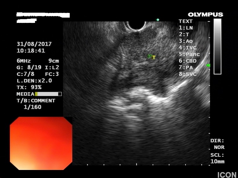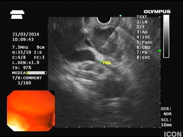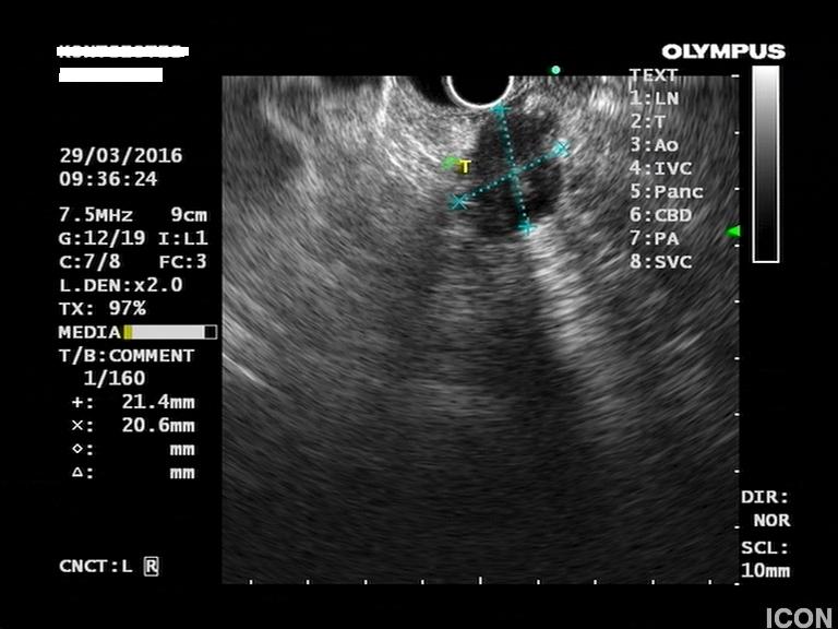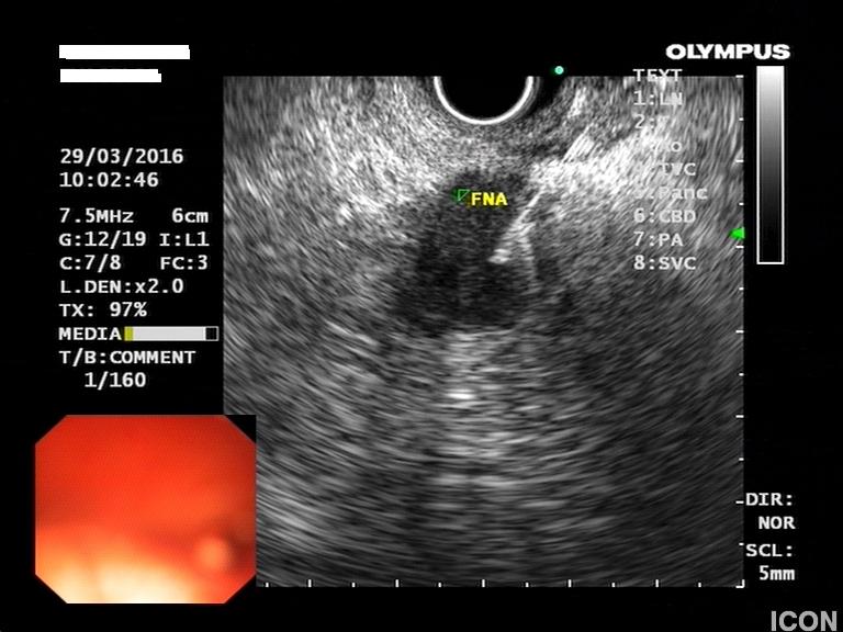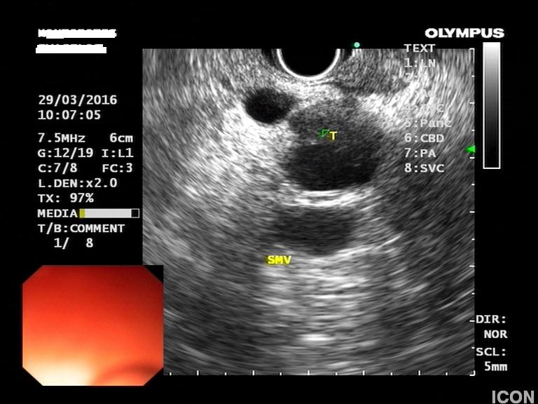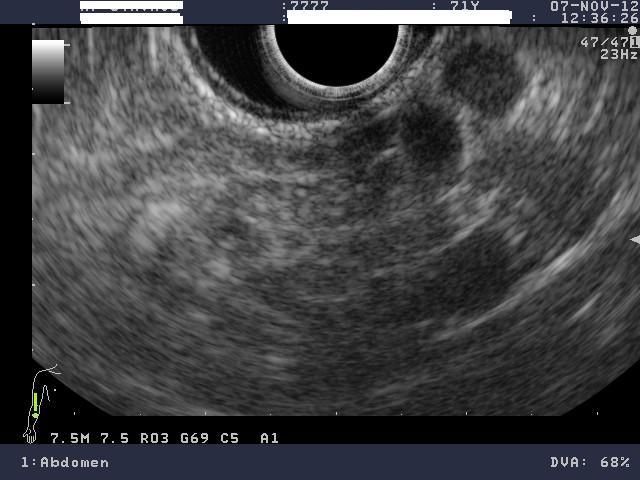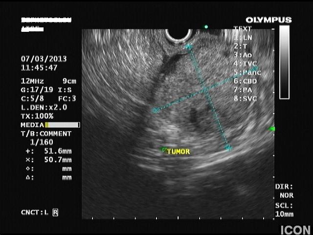 Ο ασθενής υποβλήθηκε σε ενδοσκοπικό υπέρηχο που έδειξε μια υποηχοϊκή μάζα διαμέτρου 21 χιλιοστών, με σαφή όρια, στην παγκρεατική κεφαλή και μεγάλη διάταση του χοληδόχου πόρου και του παγκρεατικού πόρου (διάμετρος 12 χιλιοστά).
