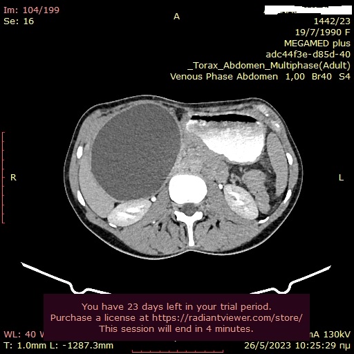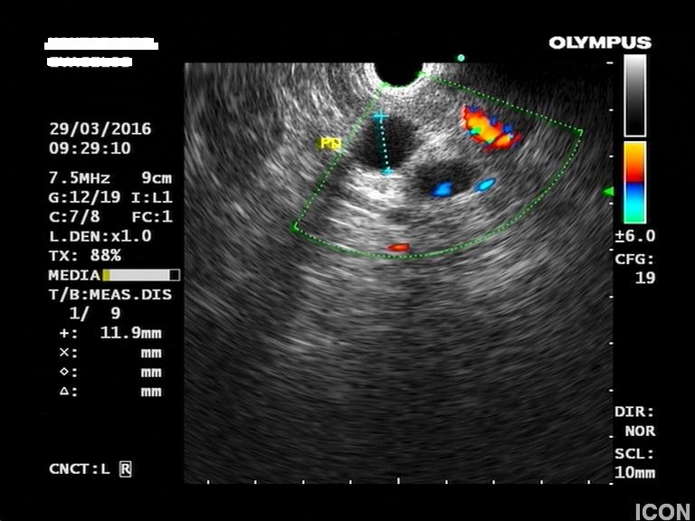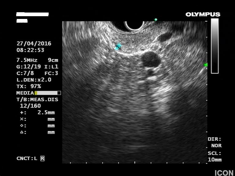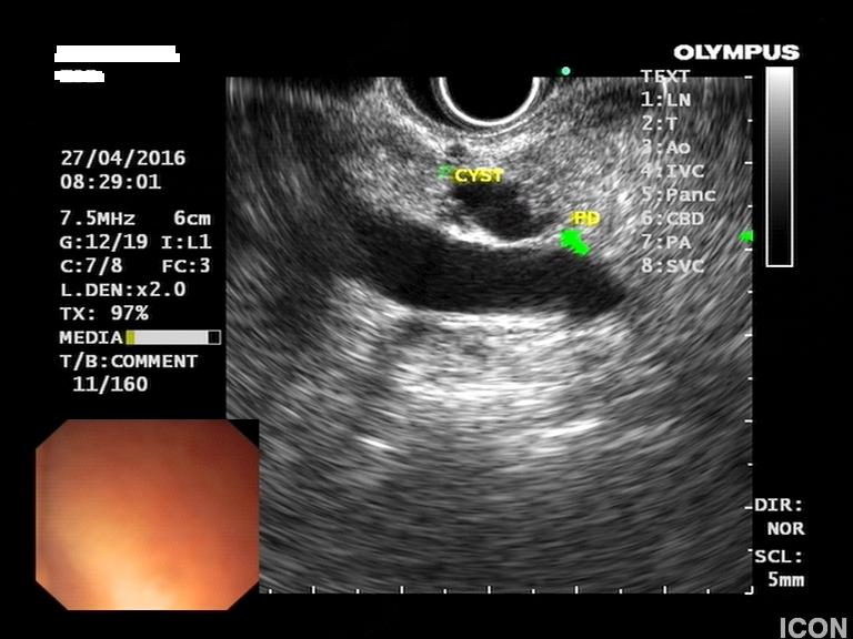 Γυναίκα 58 ετών, υποβλήθηκε προληπτικά σε υπέρηχο άνω κοιλίας όπου διαπιστώθηκε μια κύστη στην κεφαλή του παγκρέατος. Το εύρημα επιβεβαιώθηκε σε μαγνητική τομογραφία (MRI/MRCP) που δεν έδειξε άλλα παθολογικά ευρήματα στο πάγκρεας. Ο ενδοσκοπικός υπέρηχος έδειξε μια δίχωρη κύστη, διαστάσεων 6,5Χ12,5 χιλ, στην παγκρεατική κεφαλή.