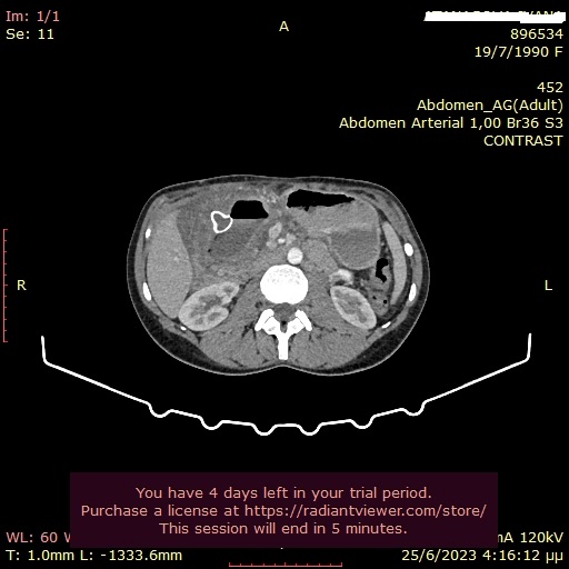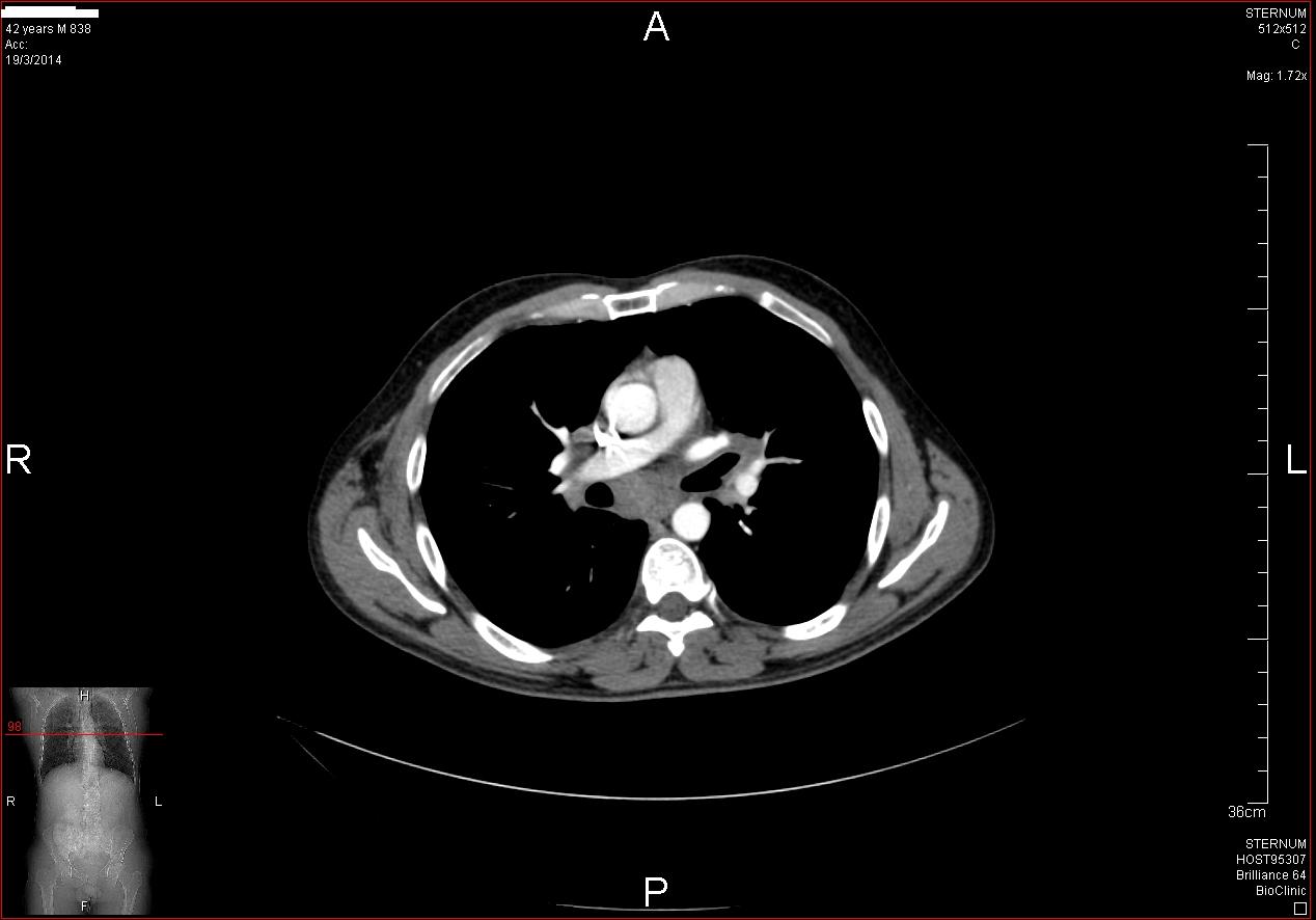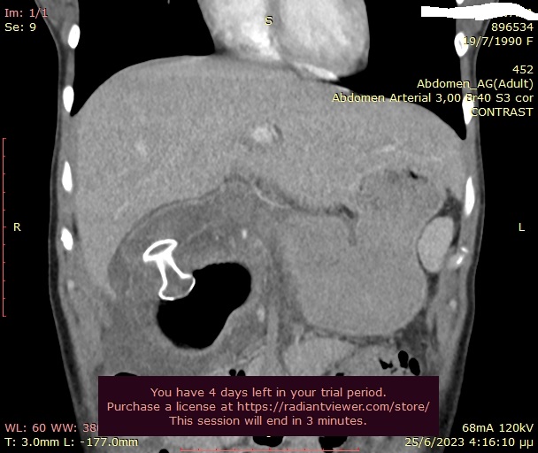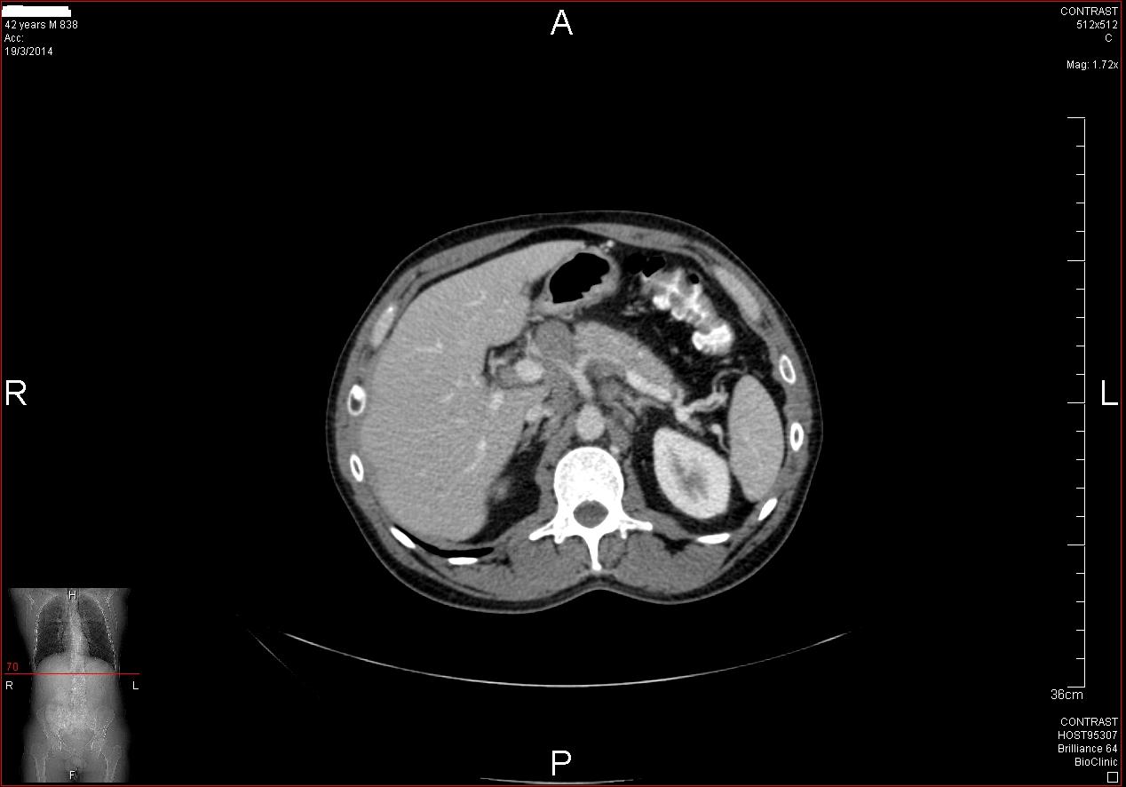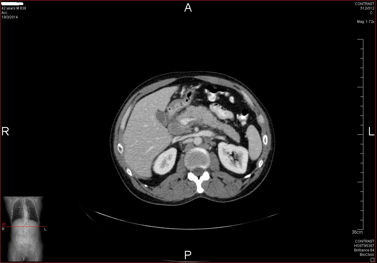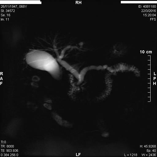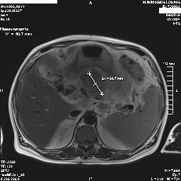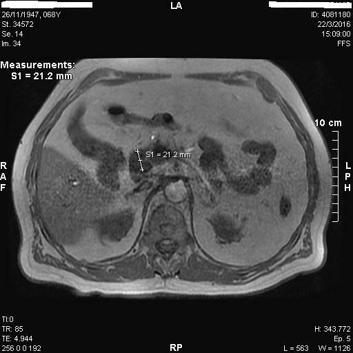 Στα πλαίσια διερεύνησης του πρωτοεμφανιζόμενου διαβήτη, υποβλήθηκε σε μαγνητική τομογραφία άνω κοιλίας (MRI/MRCP) που ανέδειξε μια συμπαγή μάζα στην κεφαλή του παγκρέατος, διαμέτρου περίπου 2εκ και μεγάλη διάταση του παγκρεατικού πόρου.