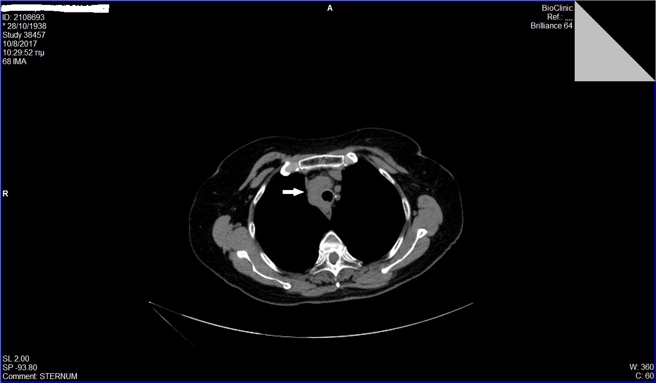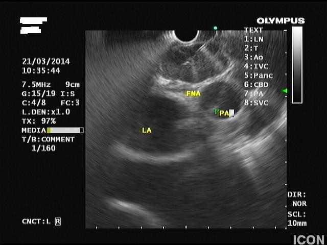 Γυναίκα 79 ετών παρουσίασε απώλεια βάρους 5 κιλών από 3μήνου, χωρίς άλλα συμπτώματα. Από το ατομικό αναμνηστικό της ήταν καπνίστρια ενός πακέτου τσιγάρων επί τουλάχιστον 40 χρόνια. Στην αξονική τομογραφία (CT) θώρακος και άνω-κάτω κοιλίας διαπιστώθηκε μια παρατραχειακή μάζα μεσοθωρακίου, διαμέτρου 3εκ. Η μάζα εκτεινόταν μπροστά από την τραχεία, κυκλοτερώς προς τα δεξιά της, μέχρι όπισθεν της και παραοισοφαγικά. Η ασθενής υποβλήθηκε αρχικά σε βρογχοσκόπηση που ήταν φυσιολογική χωρίς να τεθεί η διάγνωση και στη συνέχεια παραπέμφθηκε για βιοψία της μάζας με ενδοσκοπικό υπέρηχο (EUS). Στον ενδοσκοπικό υπέρηχο, η μάζα ήταν υποηχοϊκή, ανομοιογενής, με αγγειοβρίθεια . Έγινε βιοψία με λεπτή βελόνη 22g (FNA X 3) από διαφορετικές θέσεις της μάζας. Η κυτταρολογική εξέταση με cell block έδειξε μορφολογικά και ανοσοφαινοτυπικά ευρήματα συμβατά με μικροκυτταρικό καρκίνωμα πνεύμονα (θετική ανοσοϊστοχημεία σε TTF-1, CD56 και γενική κερατίνη). Η ασθενής παραπέμφθηκε σε ογκολόγο για έναρξη χημειοθεραπείας.