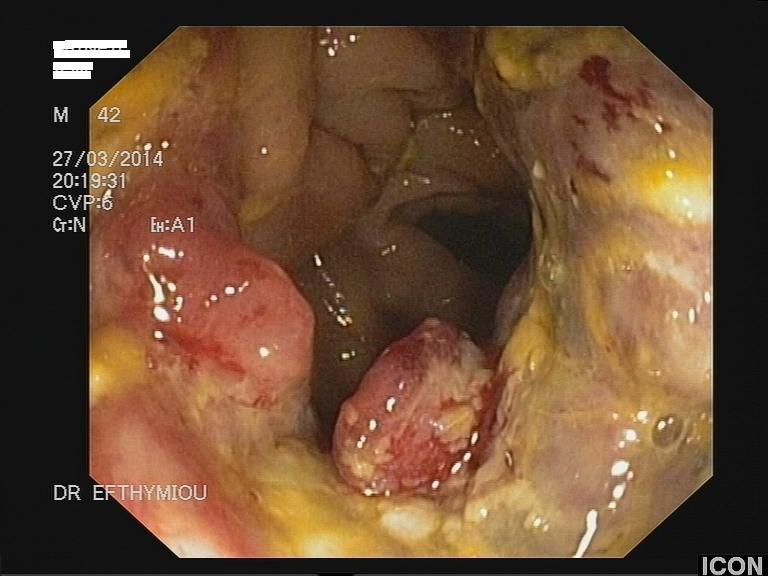 Άνδρας 43 ετών, χωρίς προηγούμενο ατομικό ή οικογενειακό ιστορικό, εμφάνισε επίμονους εμέτους και επιγαστραλγία. Υποβλήθηκε σε αξονική τομογραφία θώρακος, άνω και κάτω κοιλίας από το θεράποντα ιατρό του που έδειξε διάχυτη θωρακική και κοιλιακή λεμφαδενοπάθεια, με διογκωμένους λεμφαδένες στον υποτροπιδικό χώρο, στον αλλήρειο τρίποδα, στον ηπατοδωδεκαδακτυλικό σύνδεσμο και πέριξ του παγκρέατος. Ο ασθενής παραπέμφθηκε για ενδοσκοπικό υπέρηχο και λήψη βιοψιών από τους λεμφαδένες. Έγινε βιοψία με ειδική βελόνα για λήψη ιστοτεμαχίων (Pro-Core 19g) από λεμφαδένες σε 3 διαφορετικές θέσεις (υποτροπιδικά, αλληρείου τρίποδα και ηπατοδωδεκαδακτυλικού συνδέσμου). Η ιστολογική εξέταση και ο ανοσοϊστοχημικός έλεγχος έδειξε αδενοκαρκίνωμα χαμηλής διαφοροποίησης χωρίς θετικότητα στις επιμέρους, ειδικές χρώσεις. Ο ενδοσκοπικός έλεγχος του πεπτικού επιβεβαίωσε την ύπαρξη νεο-εξεργασίας στην ηπατική καμπή του παχέος εντέρου που ιστολογικά ήταν ένα αδενοκαρκίνωμα χαμηλής διαφοροποίησης. Ο ασθενής παραπέμφθηκε για προεγχειρητική χημειοθεραπεία και χειρουργική αντιμετώπιση.