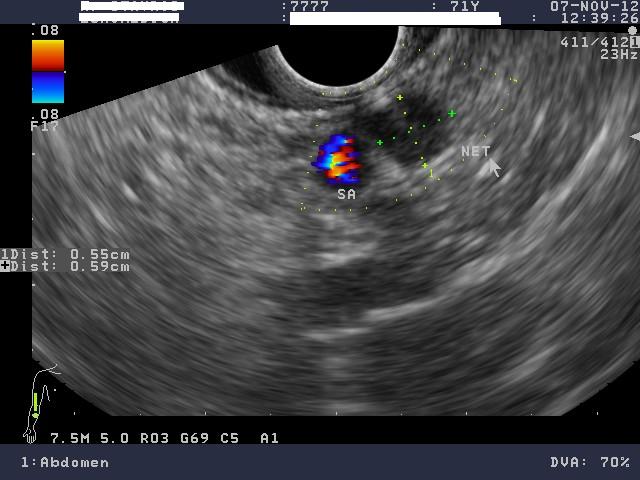 Άνδρας 71 ετών παρουσίαζε υποτροπιάζοντα επεισόδια υπογλυκαιμίας από 2ετίας. Είχε υποβληθεί σε λεπτομερή ορμονολογικό έλεγχο σε εξειδικευμένο ενδοκρινολογικό κέντρο που ήταν συμβατός με υπερπαραγωγή ινσουλίνης από πιθανό ινσουλίνωμα. Παρά ταύτα, ο απεικονιστικός έλεγχος με αξονική τομογραφία άνω-κάτω κοιλίας με λεπτές τομές (MDCT) και μαγνητική τομογραφία (MRI) κοιλίας δεν ανέδειξε τον όγκο. Ο ασθενής παραπέμφθηκε για έλεγχο του παγκρέατος με ενδοσκοπικό υπέρηχο (EUS). Ο ενδοσκοπικός υπέρηχος με linearενδοσκόπιο έδειξε ένα στρόγγυλο, υποηχοϊκό μόρφωμα, με ομαλή παρυφή, διαμέτρου μόλις 6 χιλιοστών στα όρια σώματος και ουράς του παγκρέατος. Δεν κρίθηκε σκόπιμο να γίνει βιοψία, αφού τα ευρήματα ήταν τυπικά ενός νευροενδοκρινικού όγκου. Το ινσουλίνωμα ήταν κοντά στην επιφάνεια του παγκρέατος και σε απόσταση από τον κυρίως παγκρεατικό πόρο. Συνεστήθη χειρουργική αφαίρεση με εκπυρήνιση του όγκου αλλά ο ασθενής προτίμησε να ακολουθήσει συντηρητική αγωγή με διαζοξίδη.