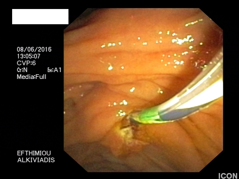 Γυναίκα 33 ετών, με ιστορικό χειρουργικής παροχέτευσης ψευδοκύστης παγκρέατος προ 8ετίας, προσήλθε με κοιλιακό άλγος και εμέτους. Η αξονική τομογραφία κοιλίας έδειξε επανεμφάνιση μιας μεγάλης ψευδοκύστης με διάμετρο 11εκ στην περιοχή της παγκρεατικής κεφαλής, η οποία προκαλούσε πιεστικά φαινόμενα στο βολβό και τη 2η μοίρα του δωδεκαδακτύλου. Η κύστη περιείχε αρκετή ποσότητα υπερηχογενούς υλικού. Έγινε παροχέτευση της κύστης με τοποθέτηση LAMS (Hot Axios stent) 15x10χιλ από το δωδεκαδάκτυλο, με την καθοδήγηση του ενδοσκοπικού υπερήχου. Η όλη διαδικασία διήρκεσε 10 λεπτά και η ασθενής εξήλθε από την κλινική την επόμενη ημέρα. Σε επανέλεγχο μετά από 2 εβδομάδες η ψευδοκύστη είχε μικρύνει σε διάμετρο 3,3εκ. Το stent αφαιρέθηκε μετά από 5 συνολικά εβδομάδες χωρίς καμία επιπλοκή.